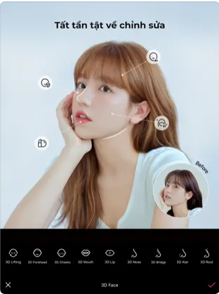 - Kéo thon, Mặt 3D, Điều chỉnh trái-phải, Preset, Đường cong: Chỉnh sửa khuôn mặt tự nhiên với từng chi tiết sắc nét.