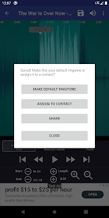 Tạo nhạc chuông miễn phí độc đáo của riêng bạn là nhanh chóng và dễ dàng. Bạn có thể đặt ghi chú bắt đầu và kết thúc bằng cách trượt mũi tên dọc theo dòng thời gian, bằng cách nhấn Bắt đầu và Kết thúc để ghi điểm hoặc bằng cách nhập vào dấu thời gian. Ứng dụng này cũng là một trình chỉnh sửa âm nhạc / trình tạo âm báo thức / trình cắt nhạc chuông và trình tạo âm thông báo.